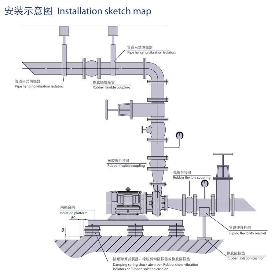 7.可根據要求采用不同材質。 GPS臥式直接離心泵安裝示意圖: