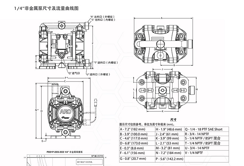 產品型號說明:PX01X-XXX-XXX-AXXXARO氣動隔膜泵非金屬型泵型號:1/4”分別有:PD02P-APS-PTA、PD02P-APS-PTT、PD0···